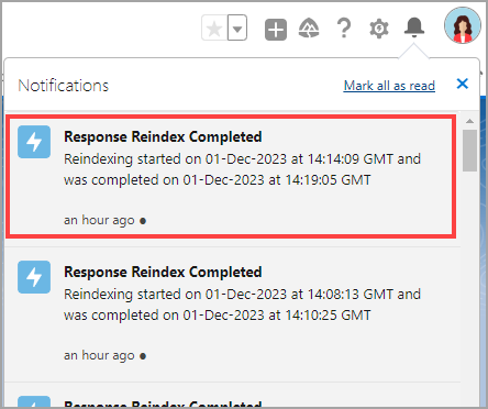 When the Reindexing process is finished and the Response Operation Status is changed to Completed, the system will send an Email and a Salesforce Push notification.