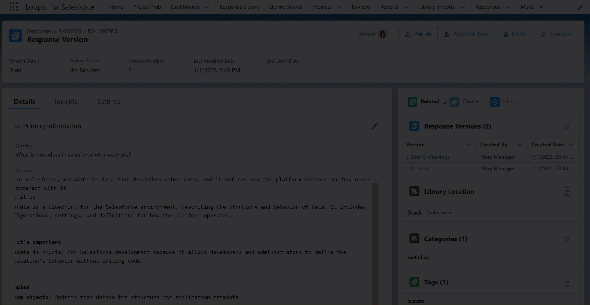 Users can add or edit the Alternative Questions and Alternative Answers using the Manage button when the Response or Response Version is in In Review Status.