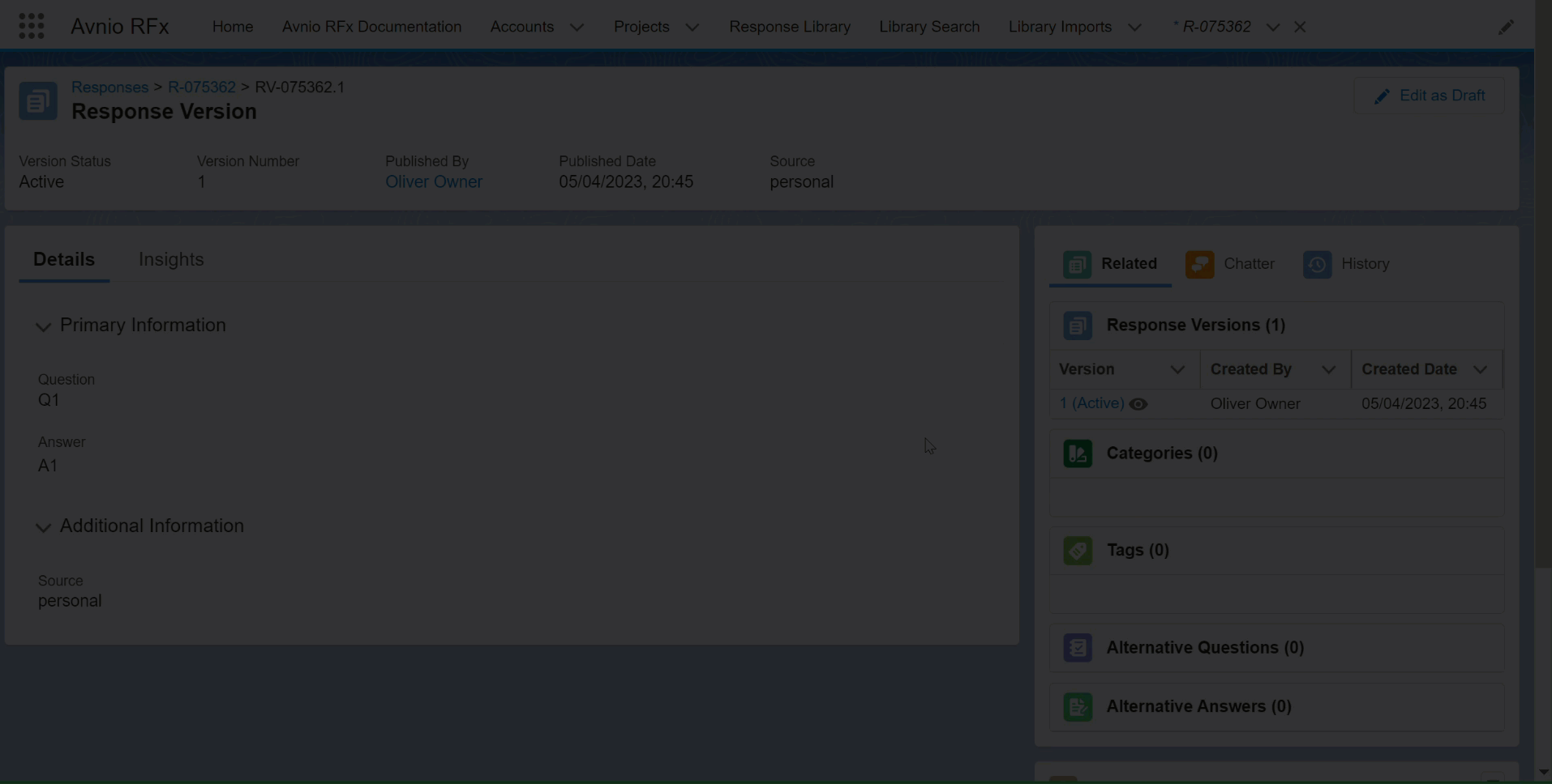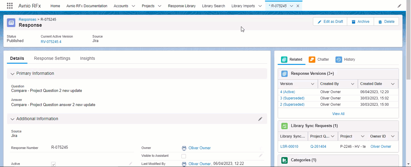 Archive | A button on the Response Details page allows you to archive the current active response version. The system will not display the archived responses in the search results when the user searches in the Response Library. You can always restore the archived response by clicking the Edit as Draft button. It will create a new draft response version for you to edit and publish. |