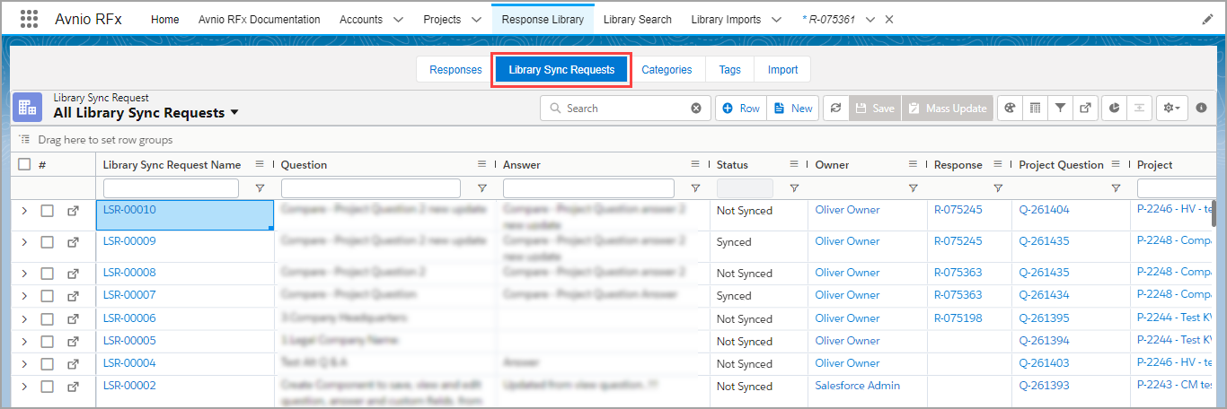 Library Sync Requests | A new tab that allows the content/library manager to view all library sync requests for multiple projects, regardless of whether they are synced, not synced, or ignored. You can open the specific request, make the changes if required, and publish or sync to the Response Library; however, you can also ignore it. ![]() Click to enlarge |