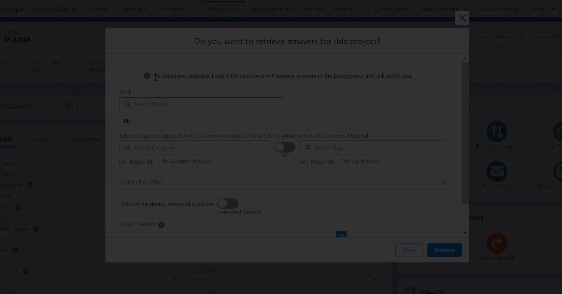 A pop-up screen displays Do you want to retrieve answers for this project? You can find the note displayed that the selected questions will be retrieved with answers in the background and notify you soon.