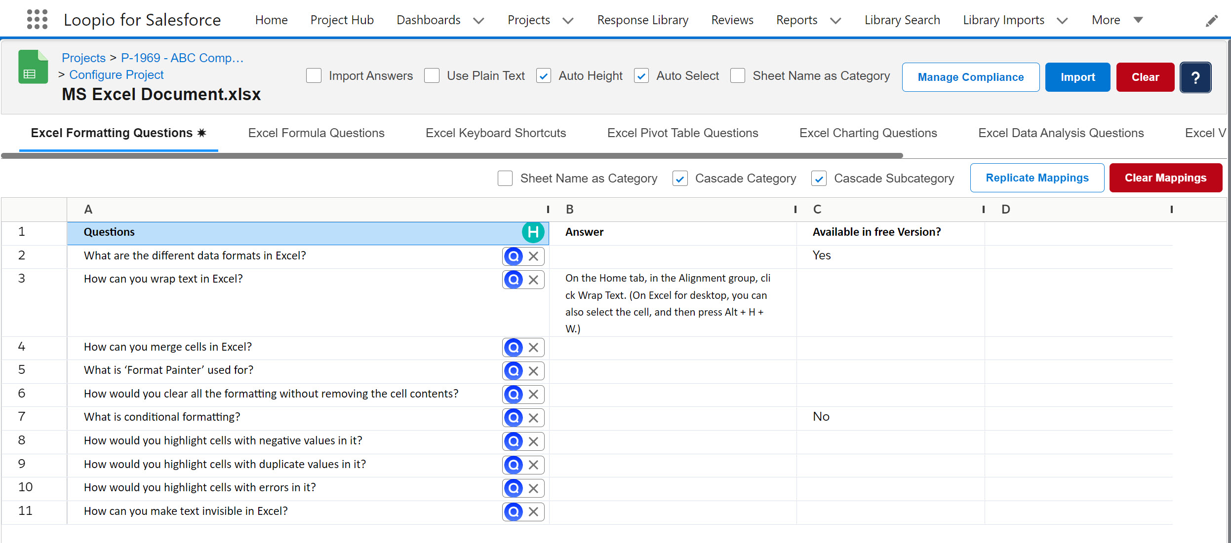 For example, you have a file with many sheets with a lot of categories, subcategories, and questions. If you finished 60% of the mapping today and want to finish the rest tomorrow, you can again import the same file and reconfigure the remaining 40% of the content tomorrow.