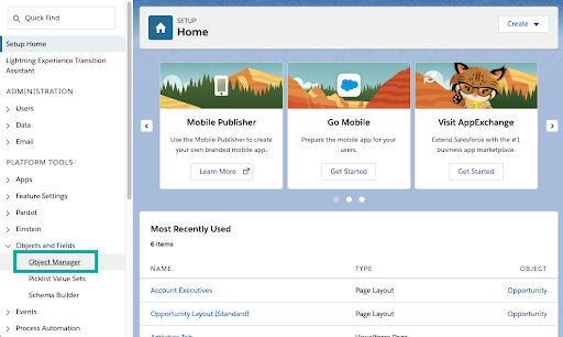 On the far left in the new tab, under PLATFORM TOOLS, select Objects and Fields and then the Objects Manager.