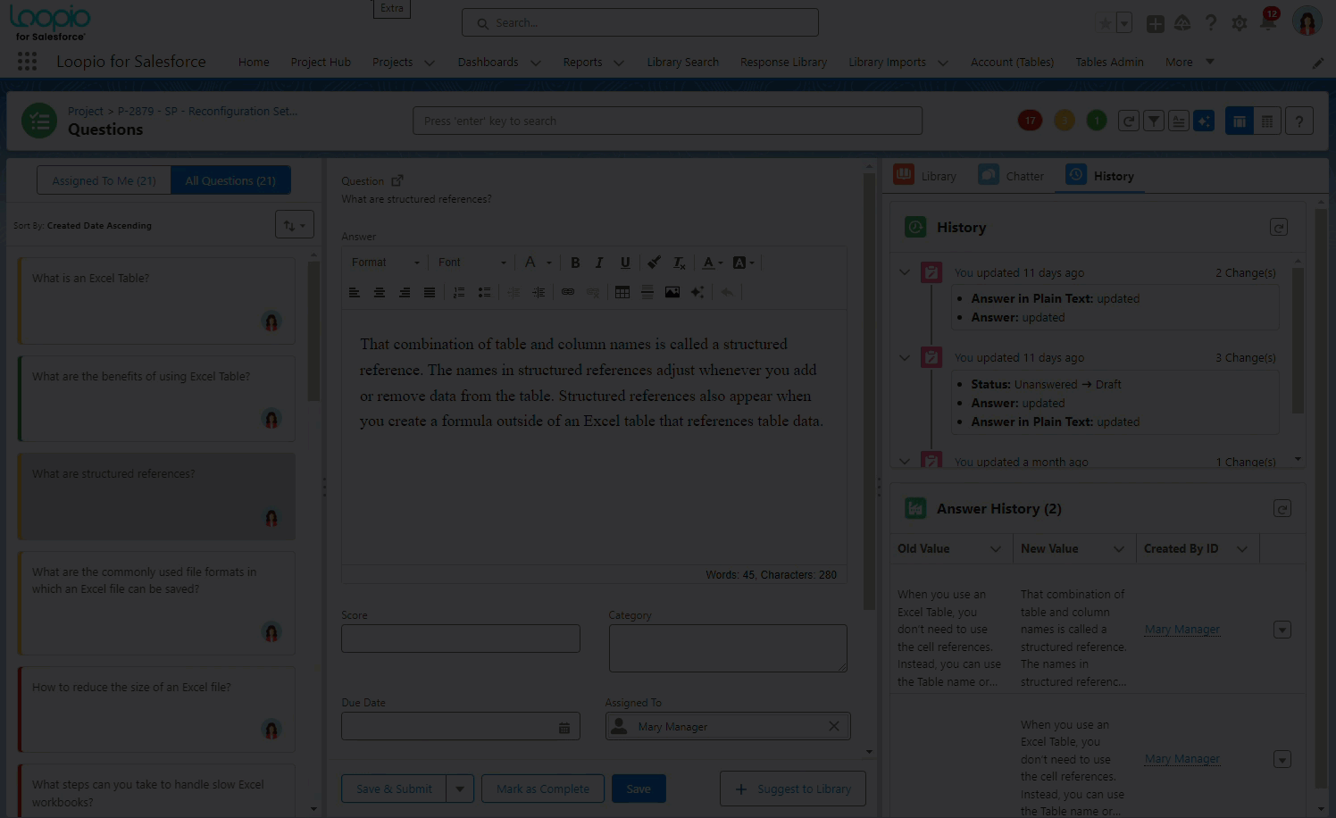 You can track all history related to specific questions, such as status changes and comments, and get all the information in one place. From the Setup > Object Manager > Project Question > Fields & Relationships > Set History Tracking, you can select the desired fields that need to be tracked on the History tab.