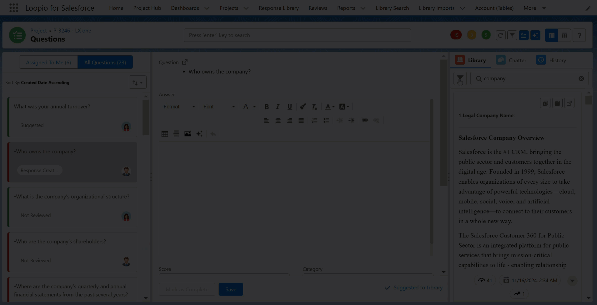 The Salesforce Administrator must set the Loopio for Salesforce Project Question setting to true in Custom Metadata Types > Advanced Field History Settings > Manage Advanced Field History Settings to track the answer history for the project question.