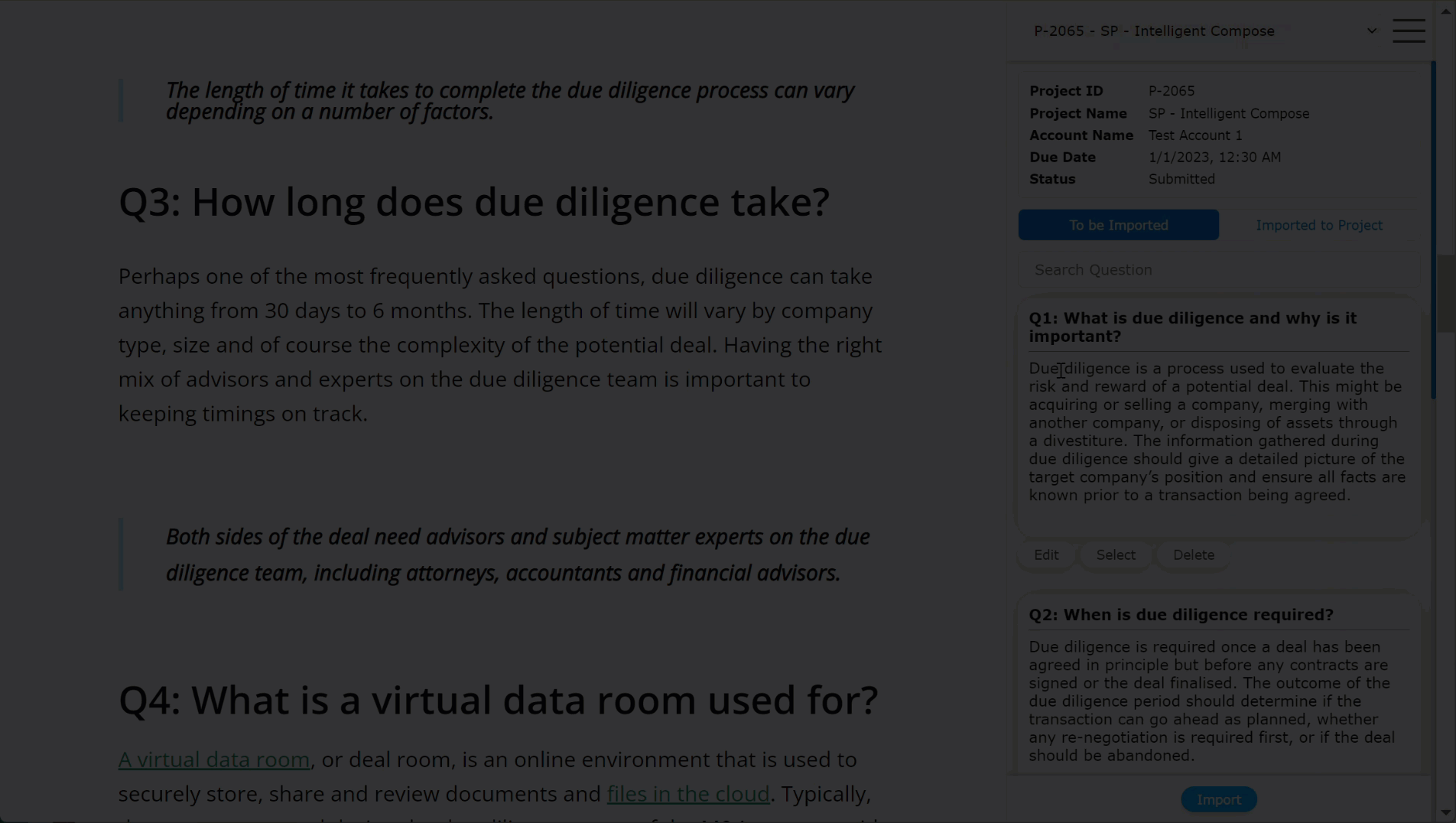 Before importing the selected question and answer to the project: