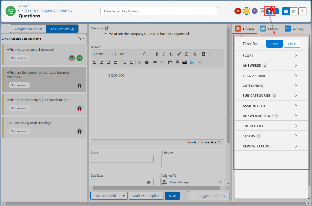 Click the color coded summary icons to automatically filter the questions display in the Assigned To Me and All Questions tab on the left side pane. You can identify the selected summary icons that are highlighted with border. The selected filters are maintained separately in both tabs so that you can frequently switch between them while filtering. You can select multiple summary icons to filter different status questions at the same time with the applied OR logic.