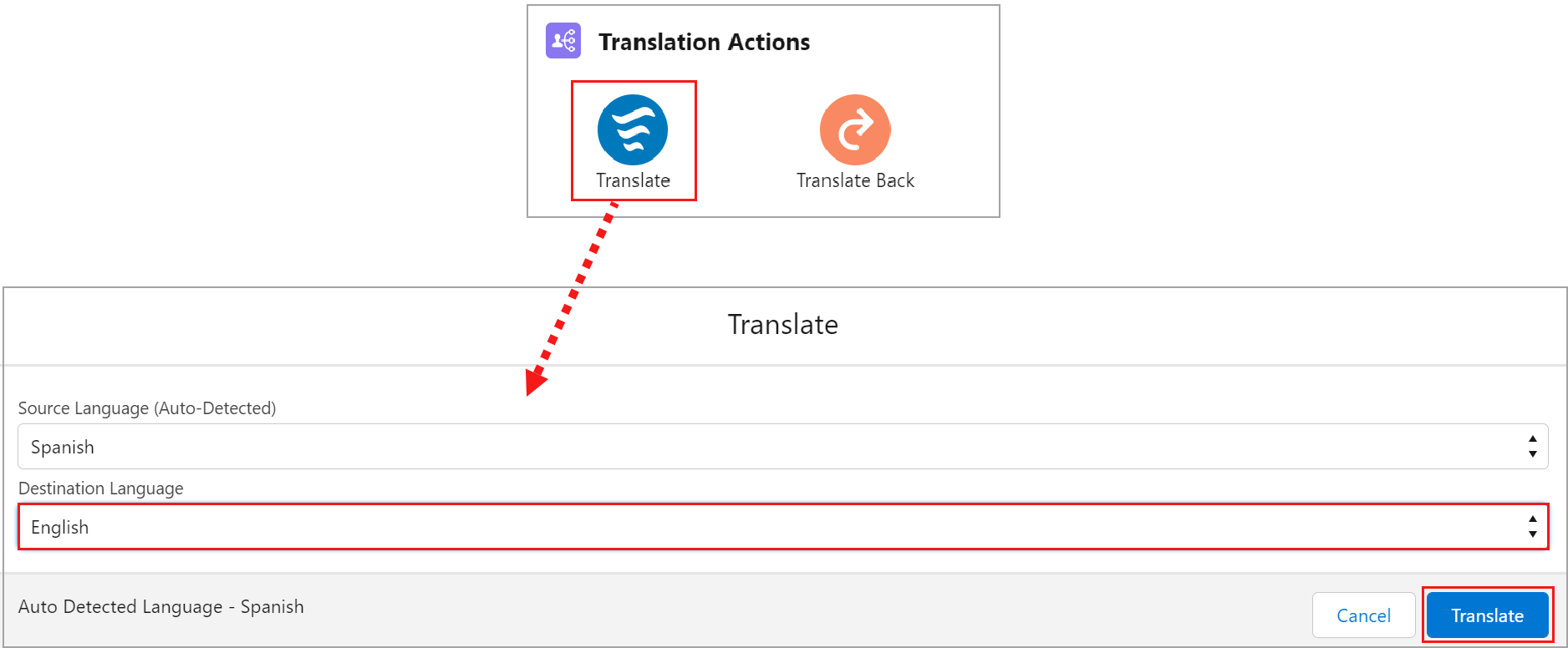 Go to the Translation Actions section and click the Translate button.